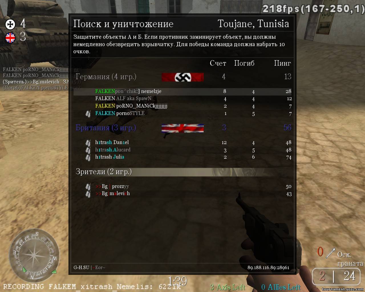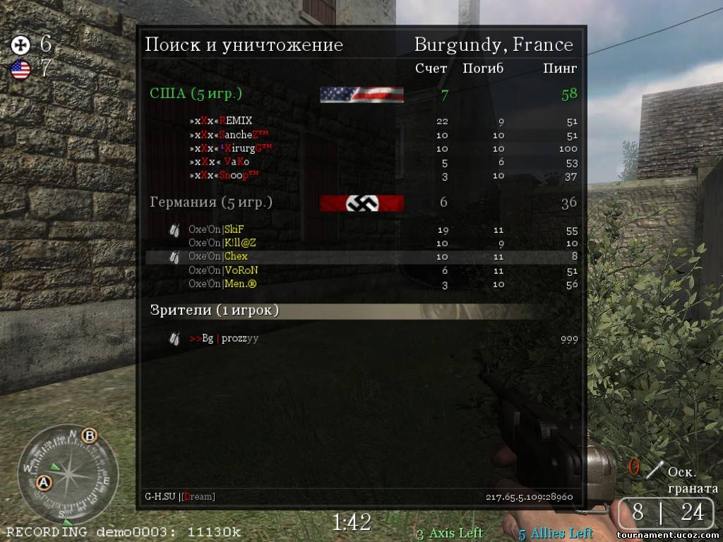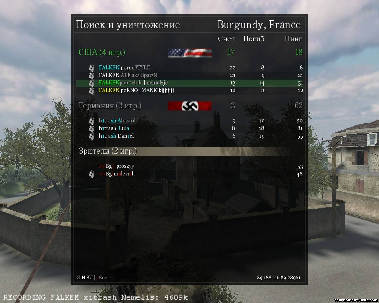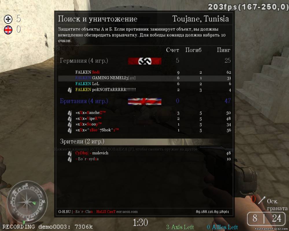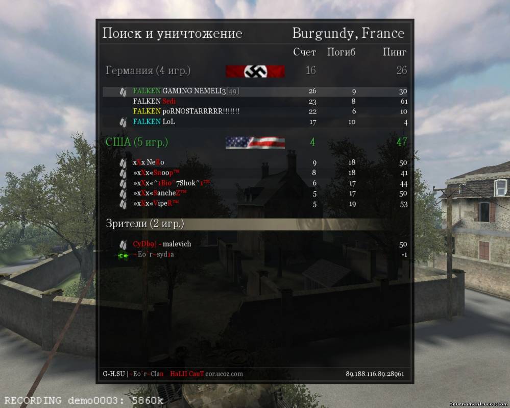 И так начнем) басню Крылова… Играли против команды Falken, так меня никогда не отстреливали, мы с командой согласовали и решили сдаться, но при этом попросив демо и скрин у Nemelis… скрины чистые как слеза младенца, для себя я заметил, что он играет со низкими настройками графики и на дерике7, т.е. тень у него не показывает. Смотрел я эту демку через чампс – это чит показывет персонажа в цвете, за стеной он одного цвета, а когда в него можно стрелять он другого.